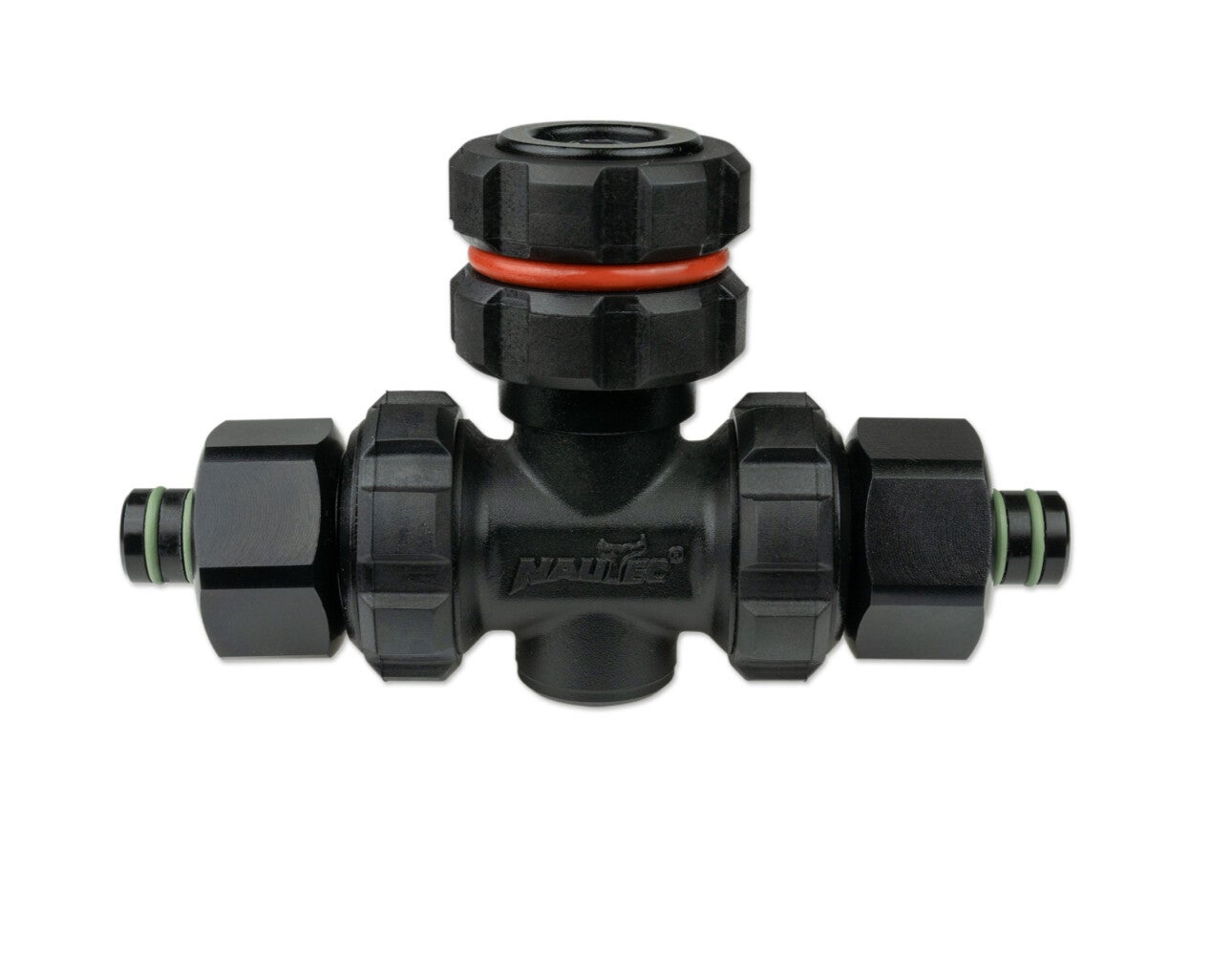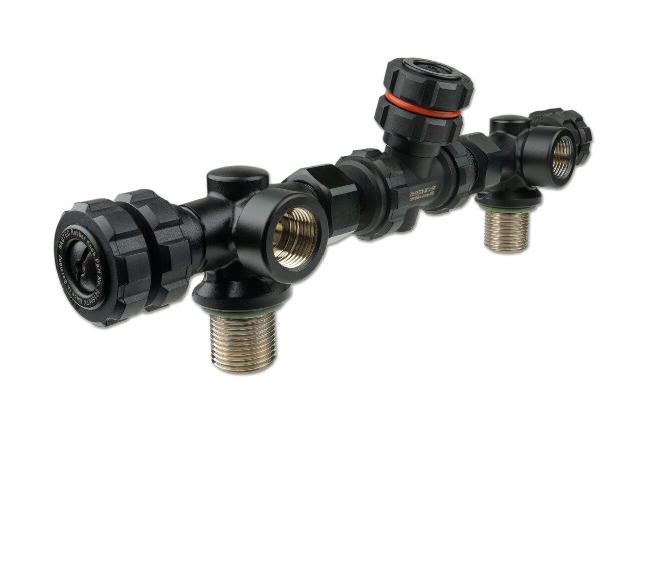 Alle Ventilausgänge sind getrennt absperrbar, der Gasfluss kann mittels der Nautec TEC-Brücke zwischen beiden Flaschen sicher getrennt werden. Gegenüber dem Handrad angeordnet, hat diese eine Anschlussmöglichkeit für ein Stummelfinimeter oder Sender eines Tauchcomputers mit 7/16″ Anschlussgewinde.